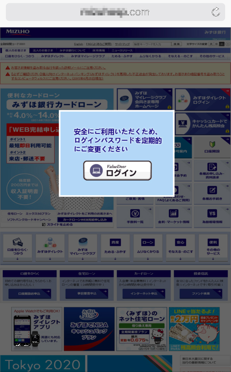 みずほ銀行をかたるフィッシングの報告を受けています。