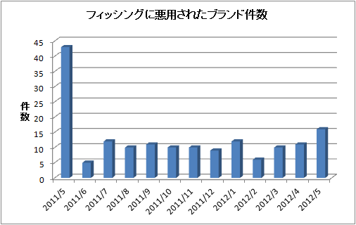 2012年5月度におけるフィッシングに悪用されたブランド件数(海外含む)は前月度より5件増加し、16件となりました。