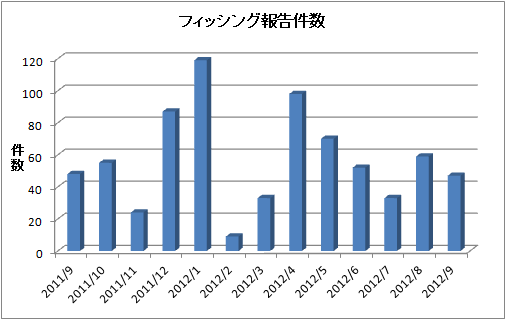 2012年9月度におけるフィッシング対策協議会に寄せられたフィッシング報告件数(海外含む)は前月度より9件減少し、47件となりました。