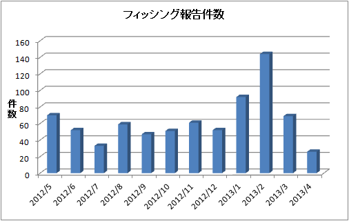 2013年4月度におけるフィッシング対策協議会に寄せられたフィッシング報告件数(海外含む)は前月度より43件減少し、26件となりました。