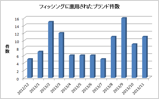2013年11月度におけるフィッシングに悪用されたブランド件数(海外含む)は前月より2件増加し、11件となりました。