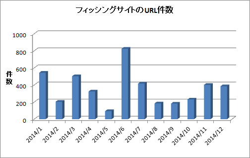 2014 年 12 月のフィッシングサイトの URL 件数 (重複無し) は、前月度より 16 件減少し、385 件となりました。