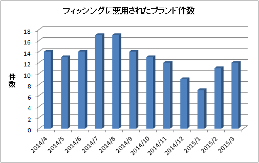 2015 年 3 月のフィッシングに悪用されたブランド件数 (海外含む) は、前月度より 1 件増加し、12 件となりました。