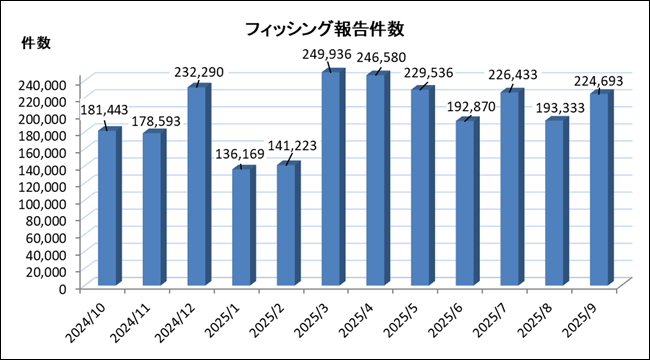 2025 年 9 月のフィッシング報告件数は 224,693 件となり、2025 年 8 月と比較すると 31,360 件、約 16.2 % 増加しました。