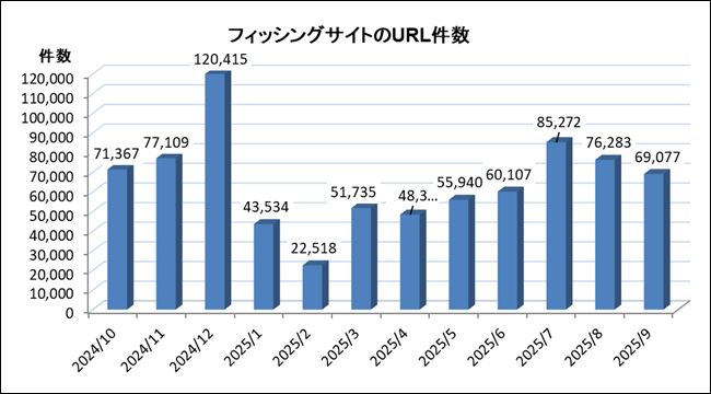 2025 年 9 月に報告を受けたフィッシングサイトの URL 件数 (重複なし) は、前月より 7,206 件減少し、69,077 件となりました。