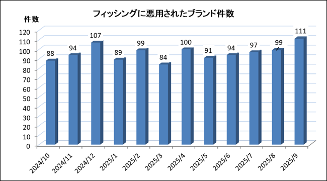 2025 年 9 月に報告を受けたフィッシングに悪用されたブランド件数は、前月より 12 件増加し、111 件となりました。