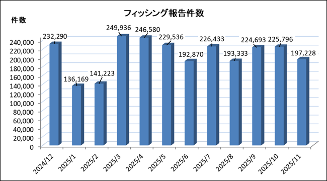 2025 年 11 月のフィッシング報告件数は 197,228 件となり、2025 年 10 月と比較すると 28,568 件、約 12.7 % 減少しました。
