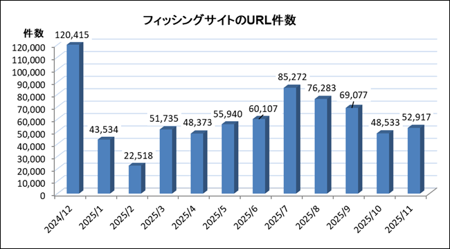 2025 年 11 月のフィッシングサイトの URL 件数は 52,917 件となり、2025 年 10 月と比較すると 4,384 件、約 9.0 % 増加しました。