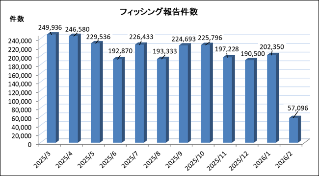 2026 年 2 月のフィッシング報告件数は 57,096 件となり、2026 年 1 月と比較すると大きく 145,254 件減少し、約 71.8 % 減となりました。