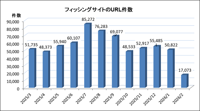 2026 年 2 月に報告を受けたフィッシングサイトの URL 件数 (重複なし) は、前月より 33,749 件減少し、17,073 件となりました。