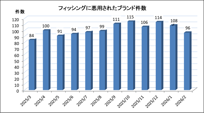 2026 年 2 月に報告を受けたフィッシングに悪用されたブランド件数は、前月より 6 件減少し、96 件となりました。