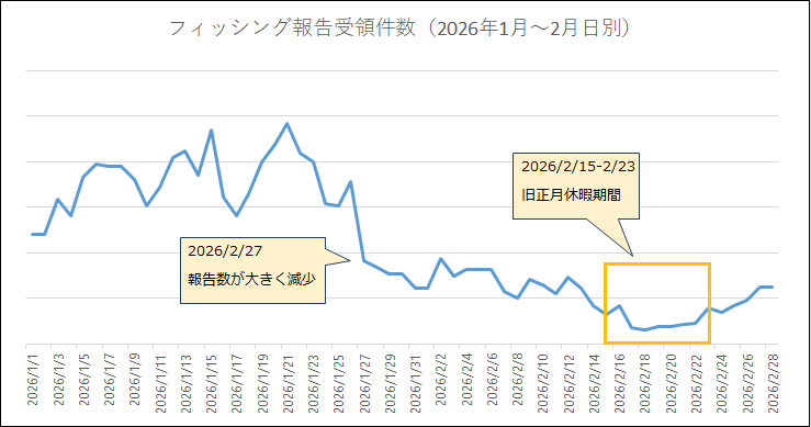 フィッシング報告受領件数(2026年1月~2月日別)