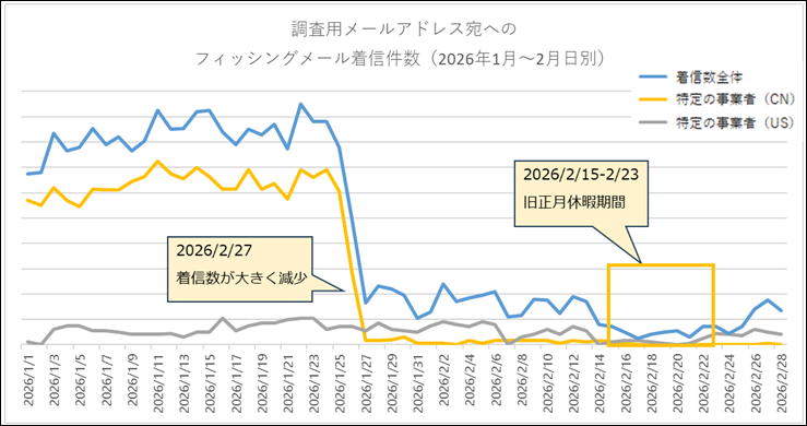(参考情報:「フィッシング報告受領件数(2026年1月~2月日別)」、「調査用メールアドレス宛てへのフィッシングメール着信件数(2026年1月~2月日別)」)