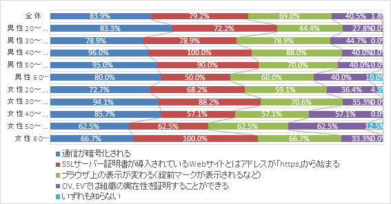 SSL サーバー証明書の導入効果について、通信が暗号化されるという認識については非常に高い結果であるのに対し、OV / EV の実在性証明や EV 導入効果についての理解は低いとの結果が出ました。